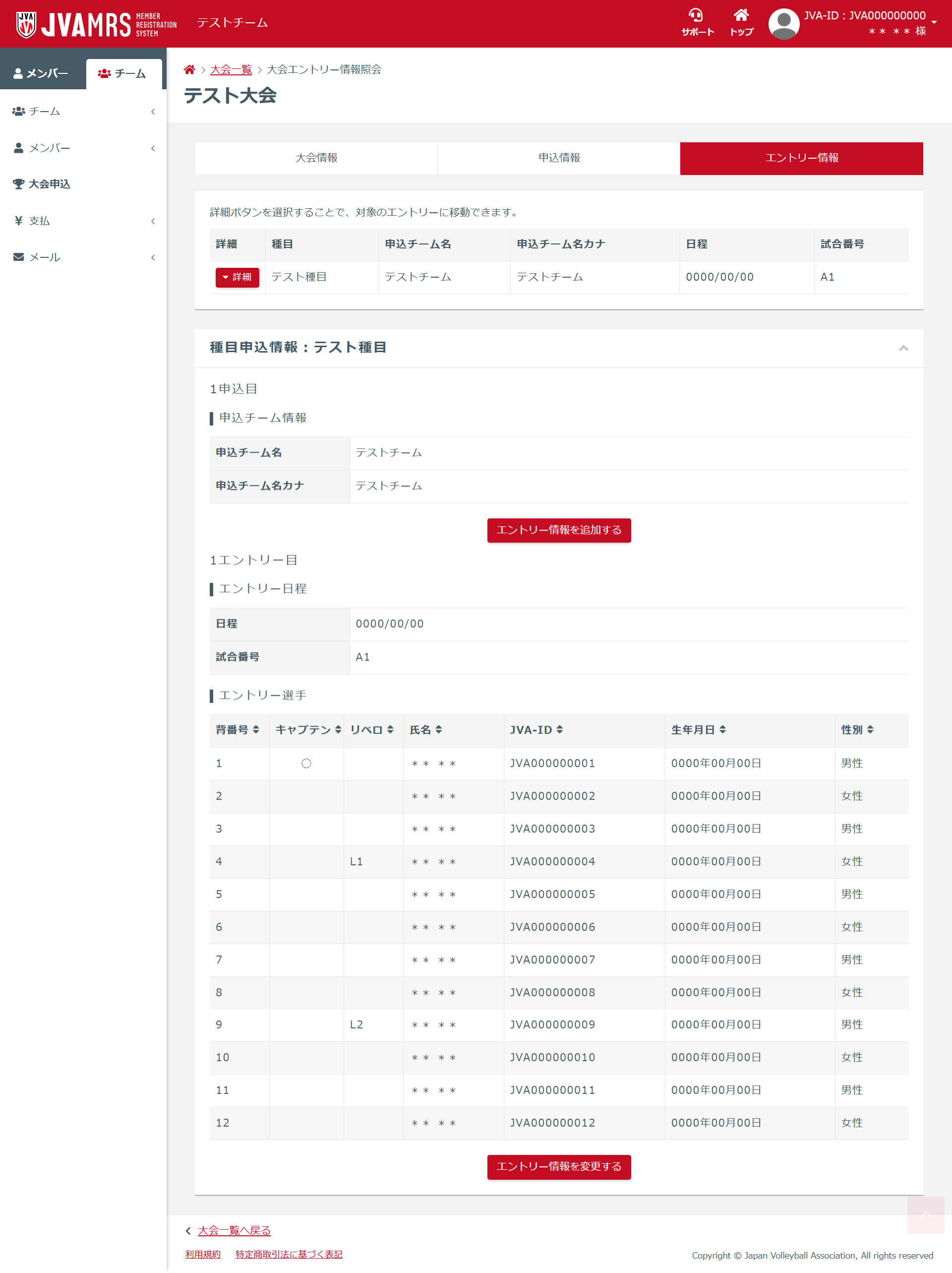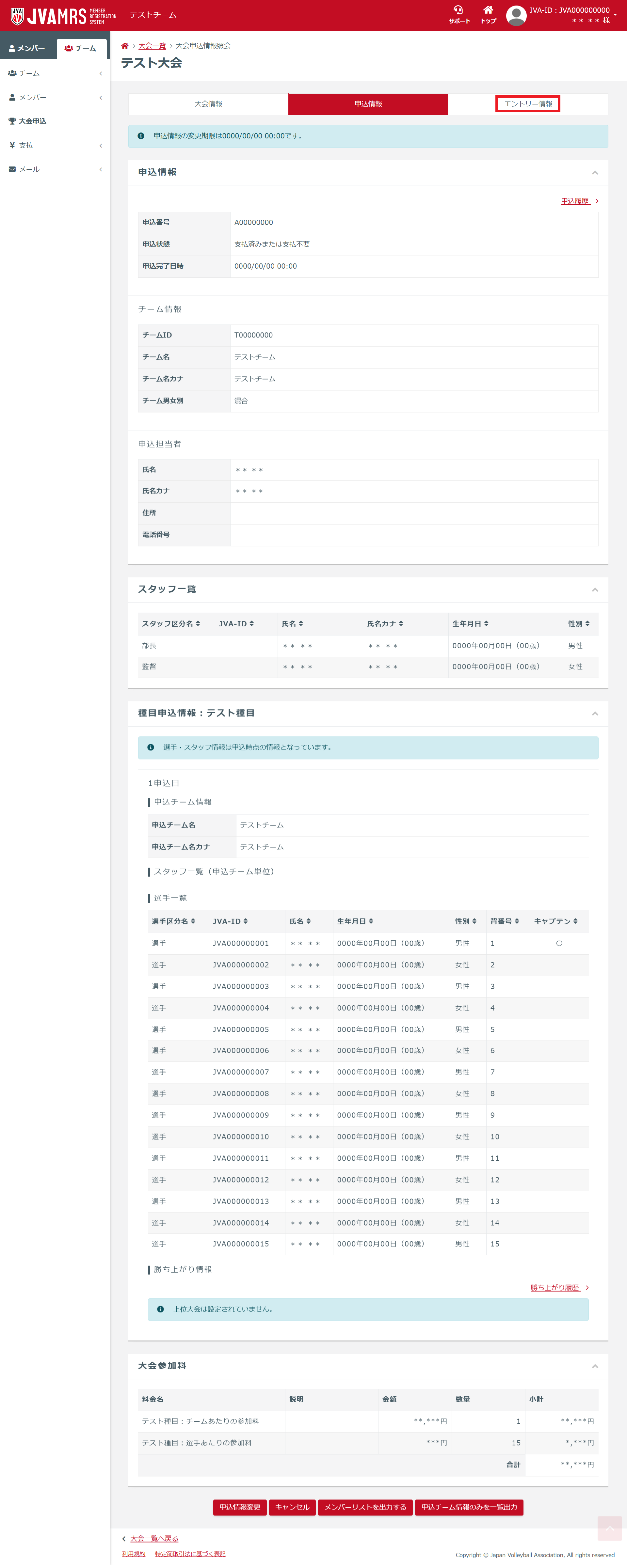 日本バレーボール協会向け 大会エントリー情報の確認 チーム責任者がマイページから大会エントリー情報を確認する手順です すでに追加している大会エントリー情報を確認することができます。 操作手順 1.チームメニューの【大会申込】を押します。 ・予めマイページにログインし、チーム用画面を表示しておいてください。 ・スマートフォンで操作する場合は、左上にある横三本線をクリックするとチームメニューが表示されます。 2.申込中の大会の【大会名】を押します。 3.大会申込情報照会の【エントリー情報】を押します。 4.大会エントリー情報を確認できます。 この記事は役に立ちましたか? はい いいえ 最近表示した記事 マニュアル 新システム移行手順 ログイン・アカウント管理・活動履歴 チ―ム責任者 チーム登録・管理 構成員登録・管理 資格登録・管理 請求書発行・支払管理 講習会申込 大会申込 イベント申込 委員会管理 お問合せフォーム よくある質問 【共通】登録手順 【共通】ログイン方法(ID・パスワード・メールアドレスなど) 【共通】チーム・構成員の登録 【共通】資格の登録 【共通】加盟料・登録料の支払い 【共通】その他 <RugbyFamily> <JGA-Web> <JHA登録管理システム> <パラスポメンバーシップ>