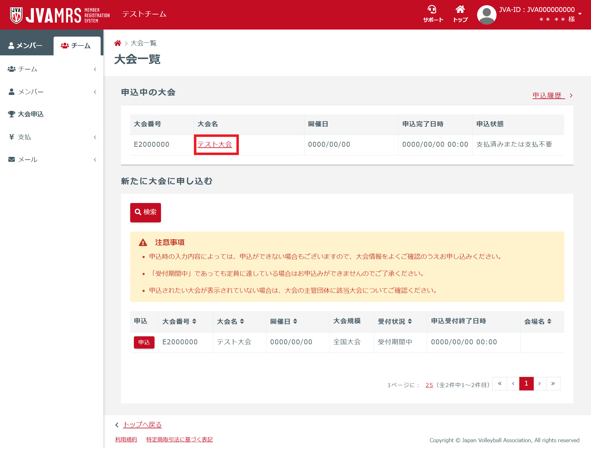 ・大会エントリー情報の変更は、主管から許可された場合のみ可能となります。