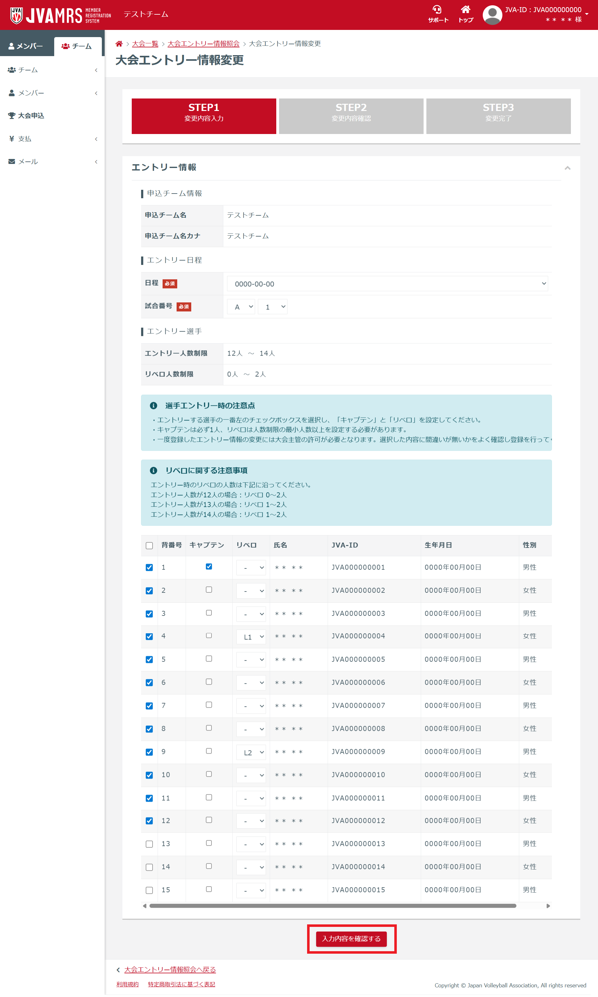・リベロの選手は、リベロ列のセレクトボックスを選択してください。